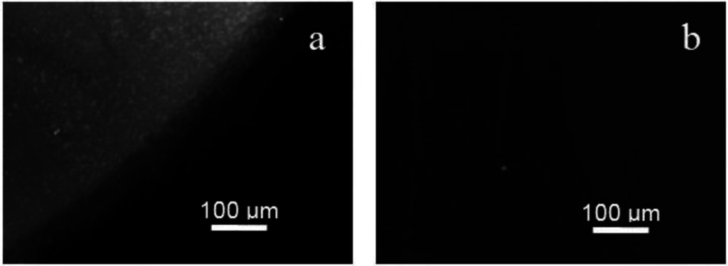 Typical epifluorescence micrographs showing the border of DNA drop on 380-nm-thick SnO2 nanoporous films after hybridization with Cy3 labelled targets in the case of (a) complementary and (b) non-complementary DNA hybridization with target concentration of 2 µM.
