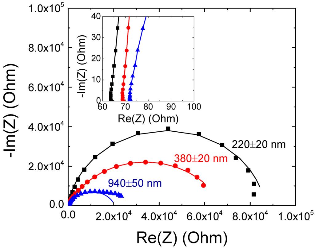 Nyquist plot (recorded at −0.5 V vs. ref.) of nanoporous SnO2/ITO electrodes with increasing film thicknesses from 220 ± 20 to 940 ± 50 nm. The filled symbols correspond to experimental data and the continuous lines to fitting data. The inset shows a zoom-in of the impedance curves at high frequency region.