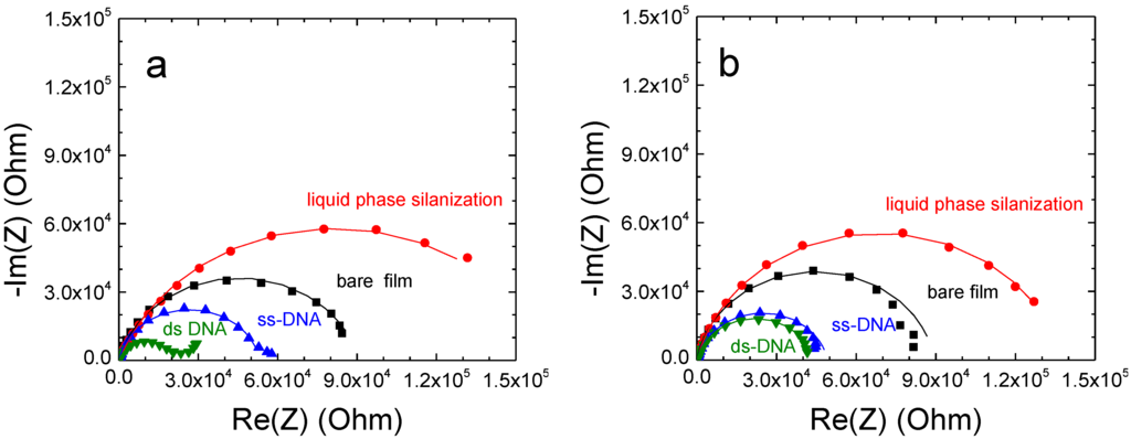 Electrochemical impedance spectroscopy (EIS) has received much attention recently for the DNA hybridization detection due to its ability to perform label-free detection. EIS can sensitively detect the change of the impedance of the electrode/electrolyte interface when the DNA target is captured by the probe. EIS measurements could be performed according either faradic or non-faradic process [10]. In the case of faradic impedance spectroscopy, the addition of a redox-active species, such as [Fe(CN)6]3−/4− [11,12] or [Ru(NH3)6]2+/3+ [13,14], to the bulk solution is required. Faradic EIS detection of DNA hybridization is generally based on the variation of the charge transfer resistance between the solution and the electrode surface [15]. On the other hand, no additional reagent is needed in the case of non-Faradic detection. Bio-modification of the electrode leads to the variation of either the capacitance of the double layer formed between the solution and the metal electrode surface or the capacitance located in the space charge layer at the sub-surface of semiconductive electrodes [16]. In this case, a sufficiently sensitive electrode material is strongly needed. Different kinds of sensitive materials for non-Faradic EIS DNA detection have been reported, including metals [17,18], conductive polymers [19,20,21] and semiconductors [22,23,24,25,26,27,28,29]. The latter can be divided into two categories including CMOS heterostructures [22,23,24] and single working electrodes [25,26,27,28,29].