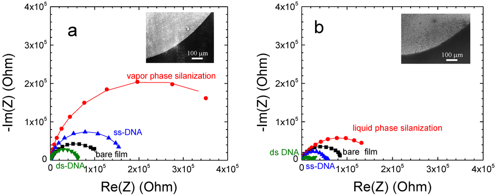 This nearly 10% increase of the EIS signal confirms that the sensitivity of the DNA detection could be improved significantly by using vapour phase silanization process. The EIS result was confirmed by fluorescence measurements carried out on the corresponding samples. It showed almost three times higher fluorescence intensity in the case of vapour phase deposition over the liquid method (insets of Figure 5).