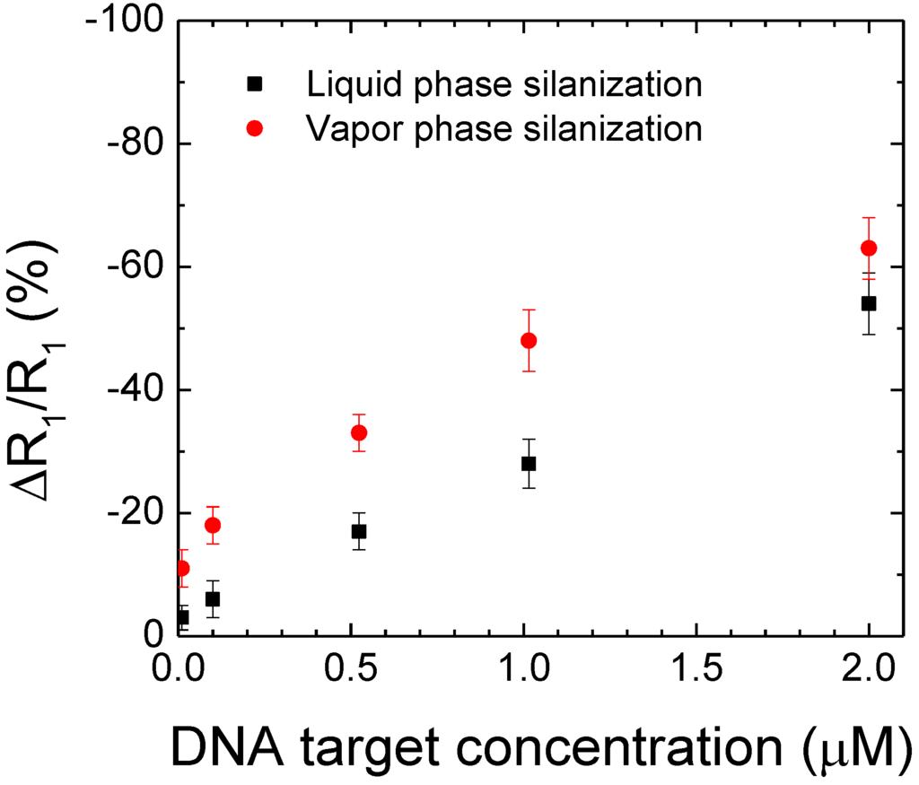 Evolution of the polarization resistance ∆R1/R1 of the biomodified SnO2 nanoporous films as a function of target DNA concentration in the case of vapour (red) and liquid phase silanization (black).