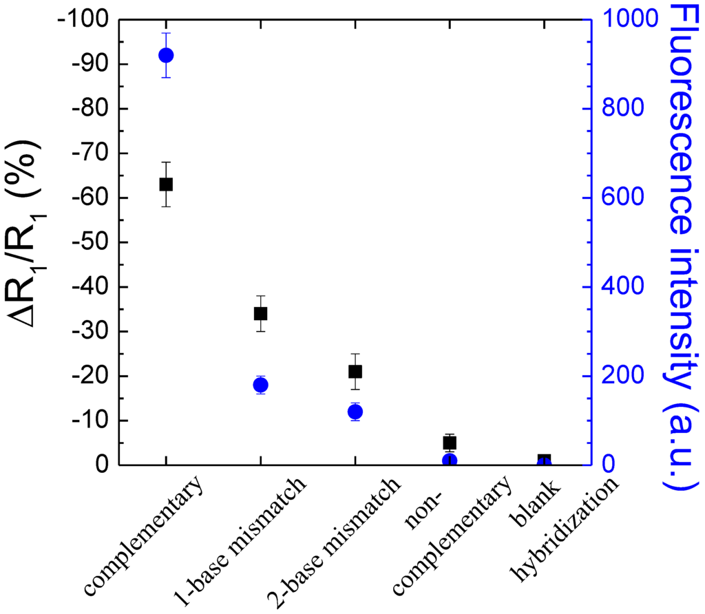 Evolutions of the polarization resistance ∆R1/R1 (%) (black) and the fluorescence signal (blue) as a function of different types of DNA target: complementary, 1-, 2-base mismatch, non-complementary and hybridization buffer without DNA target (blank hybridization).