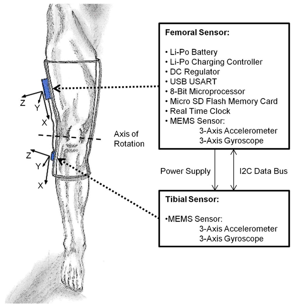 The measurement system consists of five core components: a microprocessor, inertial sensors, memory, a battery, and a charging circuit. We used an 8-bit RISC Microprocessor (Atmega328; Atmel; San Jose, CA, USA) to control our system. To measure the inertial data, we chose two microelectromechanical systems (MEMS) chips (MPU-6050; InvenSense Inc.; San Jose, CA, USA), each of which incorporates a digital triaxial accelerometer and a digital triaxial gyroscope. For timing processes, we used a real time clock (RV-8564-C2; Micro Crystal Switzerland; Grenchen, Switzerland). The raw data is stored in plain text files on a micro SD card. The microcontroller, the two MEMS sensors, and the real time clock are connected with an I2C bus. The SD card is interfaced with an SPI bus. The system also contains a USB-UART IC (FT232RL; Future Technology Devices International Limited; Glasgow, UK) for a PC connection and configuration of the sensor system. It is powered by a small, lithium polymer battery, which can be recharged using a USB connector with a small charging controller (MCP73831/2; Microchip Technology Inc.; Chandler, AZ, USA). Battery runtime and system functionality were tested in healthy subjects in long-term recordings, which are not further described in this study. With a fully charged battery (3.7 Wh), the sensor system can operate continuously for about 4–5 days. Prototypes of our system consisting of separate breakout boards are fitted into two small casings. The sensors are attached laterally at the thigh and shank, as shown in Figure 1, approximately five to ten centimeters from the knee joint line.