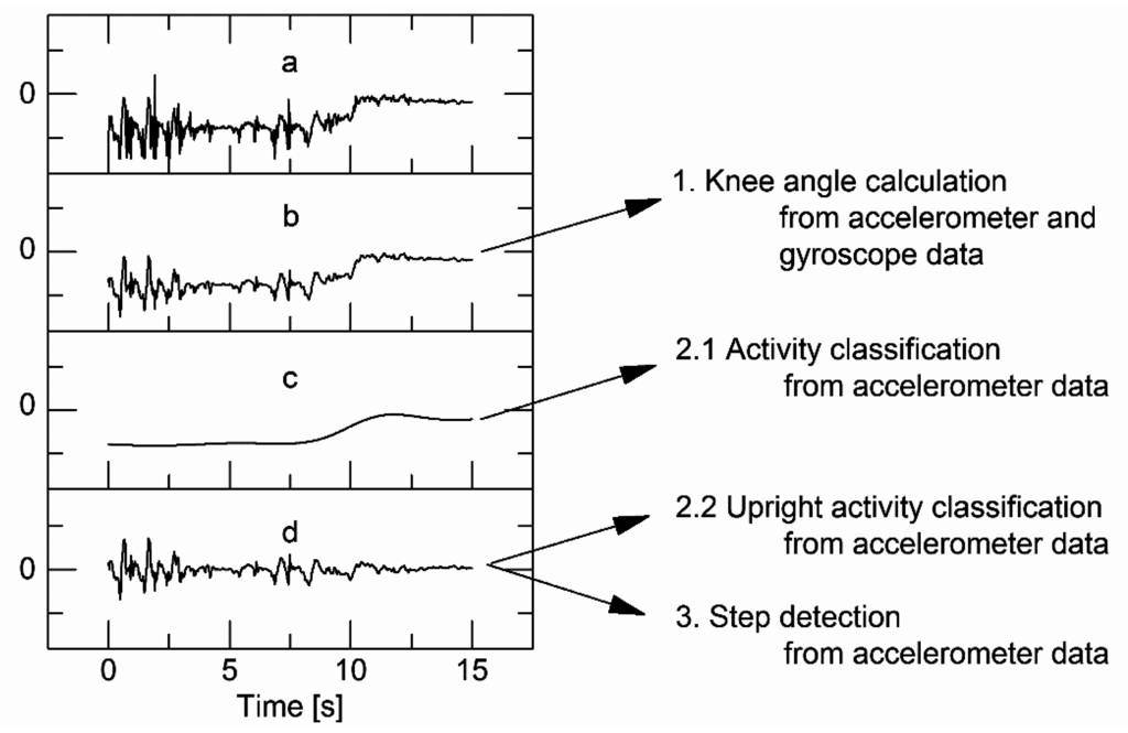 Currently, all data processing is done off-line on a personal computer. The algorithm was designed to be as simple as possible so that at least parts of it can be programmed directly onto the microprocessor in the future. In this way, the data could be calculated directly by the sensor system itself, which allows only the results to be stored, thereby minimizing the overall data output. Using this approach, the post-processing times for long-term measurements can be reduced significantly. The proposed algorithm classifies the measured activity into four categories: lying, sitting, standing, and walking in a second-by-second scheme. The algorithm detects and counts the steps taken while walking. To evaluate the patient’s range of motion, the software calculates the flexion/extension angle of the knee joint by combining the accelerometer and gyroscope data. The software algorithm was programmed using LabView 2009 (National Instruments; Austin, TX, USA). It consists of the following parts: raw data filtering and frequency separation, knee angle calculation, activity classification, and step detection. The parts are described in detail below.