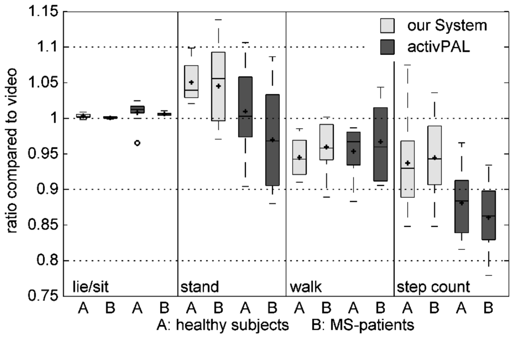 Differences between summarized activity durations from our System/activPAL compared to ground truth video data. (A: healthy subjects, B: MS patients, light gray: our system, dark gray: activPAL, rings: outliers).