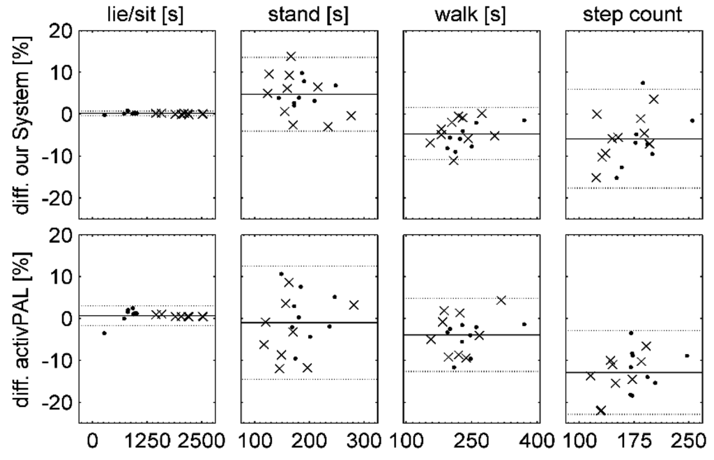 Difference of summarized activity time for our algorithm and the activPAL system compared to video data, shown as Bland-Altman plot (o: healthy subjects, X: MS patients, black line: mean error, gray line: mean error ± 1.96 SD).