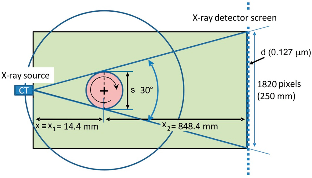 The resolution that can be achieved within the image is related to the magnification, which is defined as a function of the sample position x (i.e., the distance between the X-ray source and the sample):