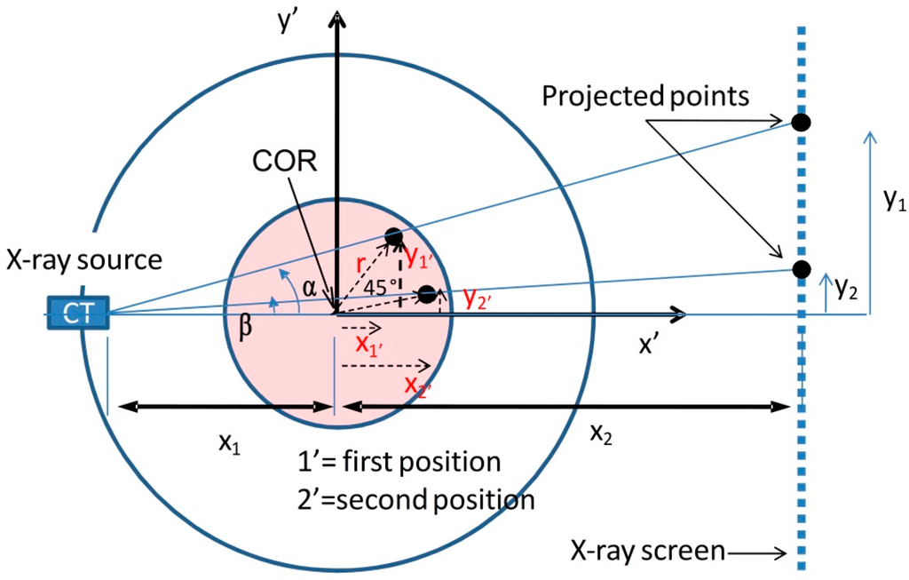 The y coordinates of the projections y1, y2 and the source-to-object and object-to-detector distances x1, x2 can be measured. Therefore the angles α and β can be derived as follows: