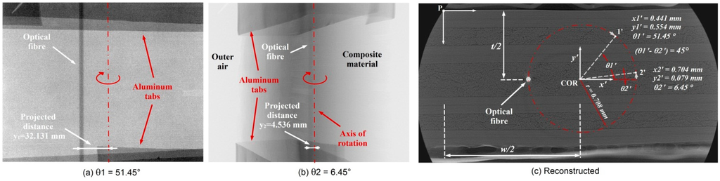 As already stated, keeping track of the sensor position after embedding is of relevance to define the real stress acting on the embedded fibre sensor and, accordingly, on the structure. Hereby the micro-CT is proposed as a tool to investigate this issue. As stated in the previous paragraph, the 2D cross-section of the scanned sample is the result of about 1500 radiographs taken at different orientations over 360°. This allows one to easily define the position of the embedded fibre, but normally the scanning time and the reconstruction process are time-consuming operations. Moreover, in some cases all this information is not needed and the only requirement is the fibre position. Theoretically, only two radiographs taken at different sample orientations are sufficient to define it. A generic approach allowing to define the position of a point in a scanned region will be considered at first, then this will be further extended to a real scan of a fibre embedded in a composite laminate. Figure 4 shows a schematic on how to geometrically determine the position of a point (i.e., optical fibre) inside a red circle (i.e., composite sample), which is rotated of 45° around its centre of rotation (COR). The projection of the point on the X-ray panel detector will shift when the red circle is rotated over this angle.