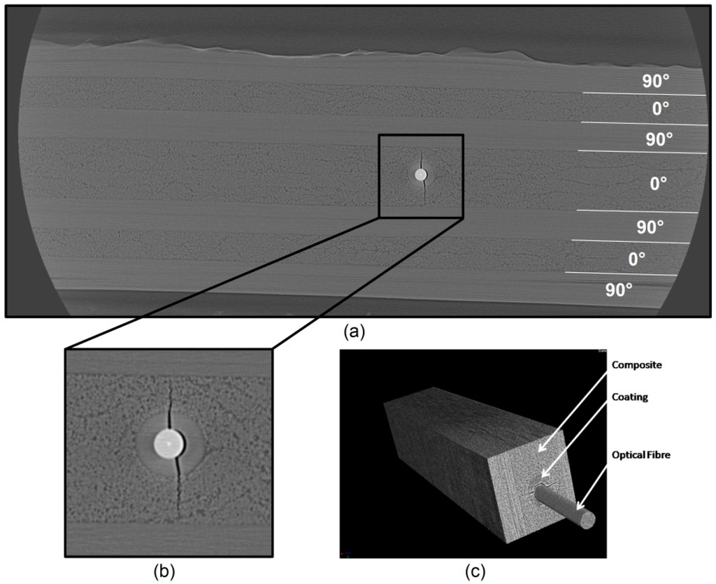 This work has presented a NDI technique, known as micro-CT, to investigate the quality of the embedding of an OFS in a CFRP laminate after production. This has set the basis for the further technique development to be applied after the production, as well as during operation, of a generic composite structure. The correct placement of the OFS during the embedding phase assures an accurate measurement (correct interpretation of the strain measured), reducing the possibility of having asymmetric stresses on the sensor. In this work, different optical fibre sensors in combination with different carbon fibre reinforced composite laminates layups have been considered. The micro-CT technique allowed to compare different embedding techniques and procedures, highlighting their benefits and drawbacks. For the MOF, the embedding quality and sensor orientation has been checked. Furthermore, it has been shown how transverse strains induced during manufacturing of a carbon fibre cross-ply laminate with an embedded fibre optic, may lead to initiations of cracks in the sensor vicinity. Damage assessment has not been considered in the current work, although the author intends to continue the research activities. In addition, it was also possible to investigate more complex fibre architecture of a woven fabric carbon-PPS laminate where a fibre optic has been embedded. This has revealed how the imprecisions during manufacturing (i.e., yarn shift during plies stacking) can lead to a very difficult to interpret spectrum of the fibre optic sensor. However, addressing the local strain profile induced from resin crystallization during production for this complex fibre architecture is at this moment non-existent. The measured reflected spectrum seems to be affected by many variables, including embedding imprecisions and local fibre architecture. Furthermore, there is no evidence of a consistent difference in the spectrum profile for the two different stacking sequences considered.