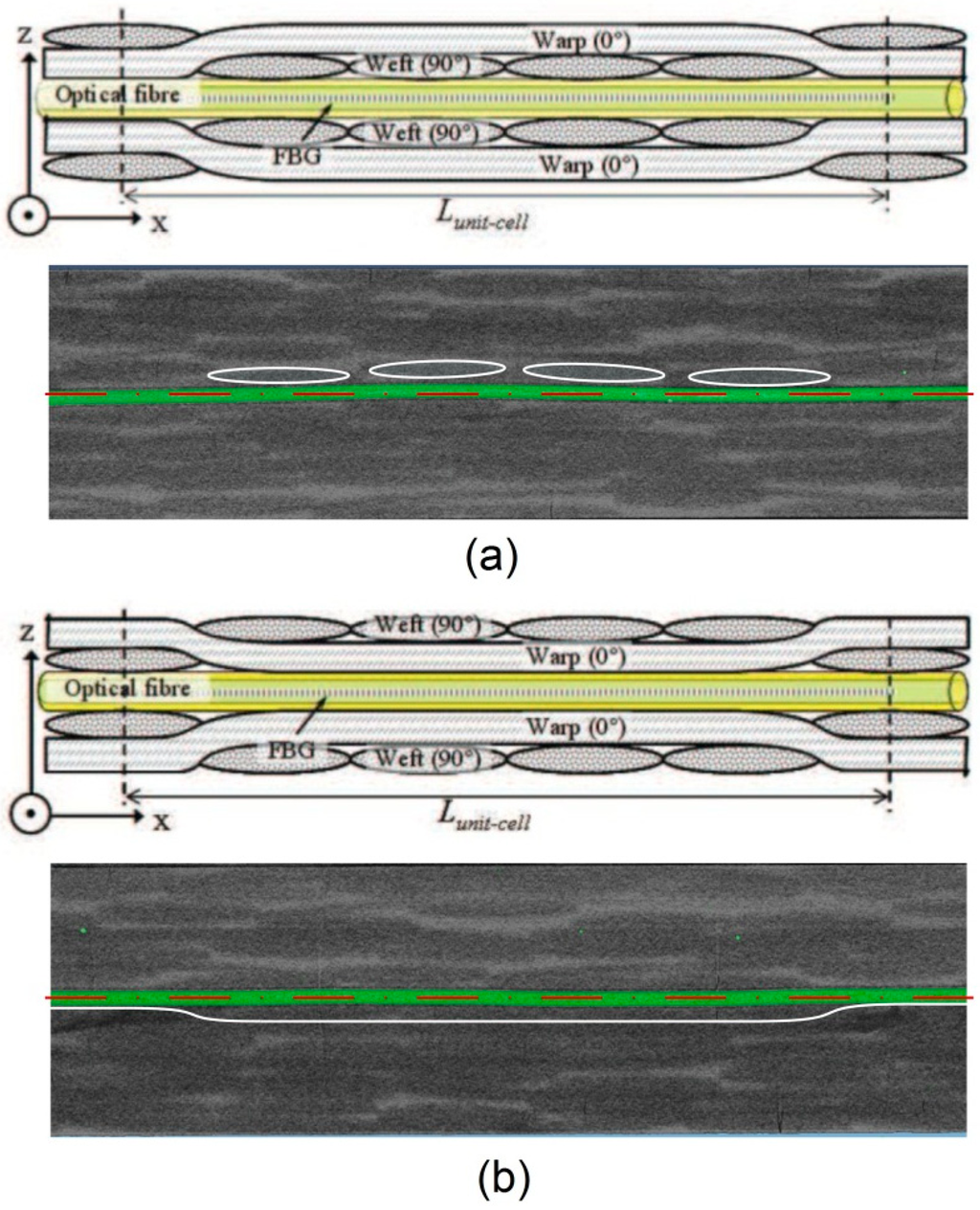 (a) Schematic and micro-CT side section of a 125 µm optical fibre embedded in a symmetrical stacked carbon-PPS [(0,90)]4s layup; (b) Same schematic and micro-CT side section obtained for a [(90,0)]4s layup. The Optical fibre has been highlighted in green colour. One can notice the bending of the fibre with respect to its axis (horizontal dash-dotted red line). The axis has been obtained from the envelope cylinder defined around the fibre. Finally, the white lines represent the envelopes of the bundle yarns of carbon fibre.