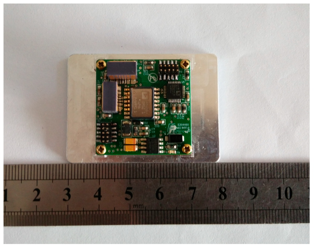 The wearable multi-sensor system is a miniature strapdown inertial navigation system designed in our lab to satisfy the needs of indoor navigation for mobile robots, UAVs and pedestrians. The multi-sensor system is composed of one three-axis accelerometer, three single-axis gyroscopes and one magnetometer and one microprocessor, as shown in Figure 1, and its small size is 32 × 32 × 15 mm. In fact, our multi-sensor system can be regarded as a combination of an IMU and magnetometer. The accelerometer uses an ADXL312 made by Analog Devices Inc. (Norwood, MA, USA), and has a measurement range of ±12 g and high resolution of 2.9 mg/LSB with I2C/SPI bus for digital output. The ADXRS453 made by Analog Devices Inc. is selected for the three single-axis gyroscopes, and it is intended for industrial applications with its features of ±300°/s angular rate sensing and 16°/h bias instability. The three-axis magnetometer uses the HMC1053 from Honeywell Corp. (Morristown, NJ, USA), with a measurement range of ±6 gauss and resolution of 0.12 milligauss. We use the STM32F407 as our microprocessor, and it is based on the high-performance ARM Corte-M4 32-bit RISC core operating at a frequency of 168 MHz and 1 Mbyte of flash memory. It provides a good data calculation performance because of its ability to work with the large number of floating calculation points of the multi-sensor system.