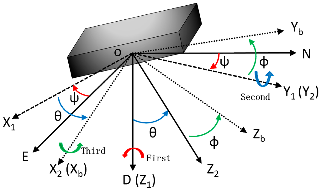 The body coordinate system (frame b) can be obtained from NED coordinate system (frame n) through three sequential rotation angles heading (ψ), pitch (θ) and roll (ϕ), which present the body attitude. The transformation matrix from ONED to OXbYbZb is written as: