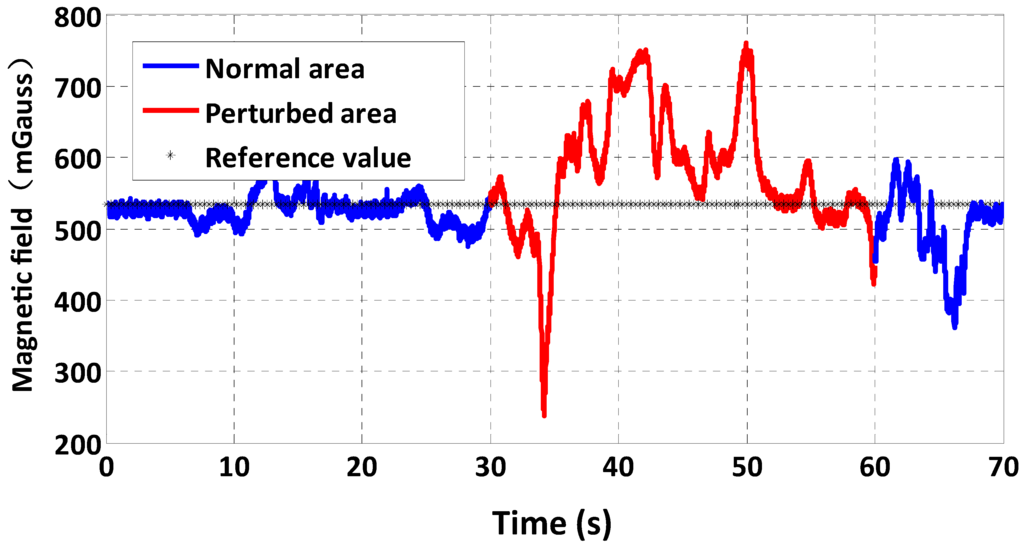 The magnetometer is easily subject to interferences from external magnetic sources such as the steel of buildings and electronic equipment. These kinds of disturbance lead to unpredictable performance of the magnetometer, which is a major drawback of using magnetic sensors. Figure 3 is an example of a test of the magnetometer of the multi-sensor system in a corridor of our college building. There are elevators and other metallic structures in the corridor which can produce magnetic sources to perturb the magnetometer, as illustrated by the red line in Figure 3. Therefore, magnetometer-based heading estimation is not reliable.