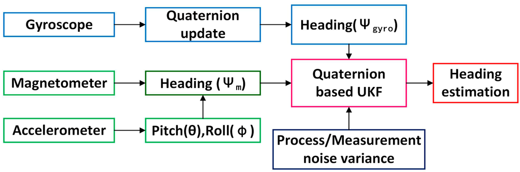 However, the gyroscope is not perturbed by indoor magnetic disturbances. In addition, the magnetometer-based heading is relatively stable in tests over longer hours. A new heading estimation method is proposed to make use of complementary features of gyroscopes and magnetometers, meanwhile, the quaternion-based UKF to eliminate the errors derived from the gyroscope and magnetometer is adopted. The flow chart of accurate heading estimation using quaternion-based UKF is shown in Figure 4.