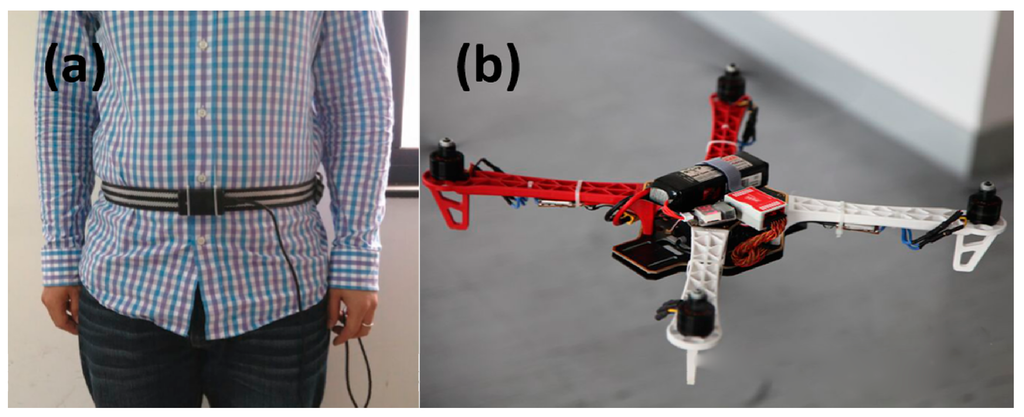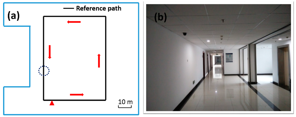 In order to verify that our wearable multi-sensor system using the quaternion-based UKF algorithm can meet the accurate heading estimation needs of robots, pedestrians and UAVs in indoor environments, we carried out two experiments in our college building corridor. One experiment is implemented with our multi-sensor system fixed on the waist of a pedestrian and the other one is carried out with our multi-sensor system fixed on a quadrotor UAV, as shown in Figure 6. The reference path of our experiments is the rectangular black line on the floor plan of our college building shown in Figure 7, and (a) is the skeleton map of floor plan; and (b) is a picture of the actual corridor from the position of the circle in (a). Both experiments are carried out strictly along the reference path in the red arrow direction. Each experiment starts from the red triangle and ends at the red triangle.