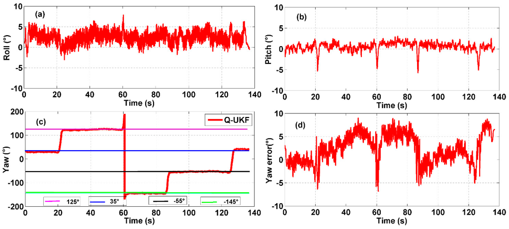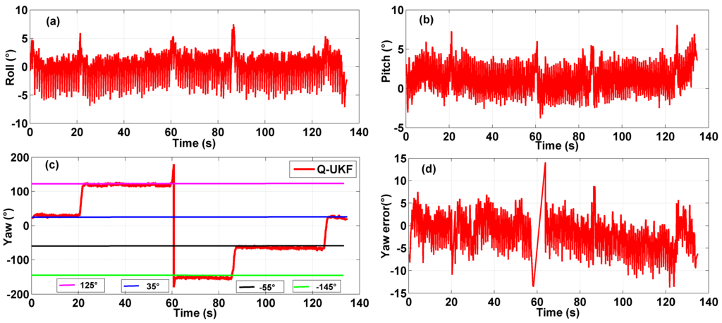 Multi-sensor system on waist of a pedestrian test: (a) roll angle; (b) pitch angle; (c) yaw angle; (d) yaw angle error.