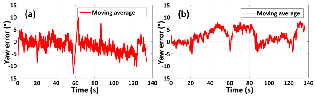 Moving average of yaw error: (a) multi-sensor system on the pedestrian test; (b) multi-sensor system on the quadrotor test.