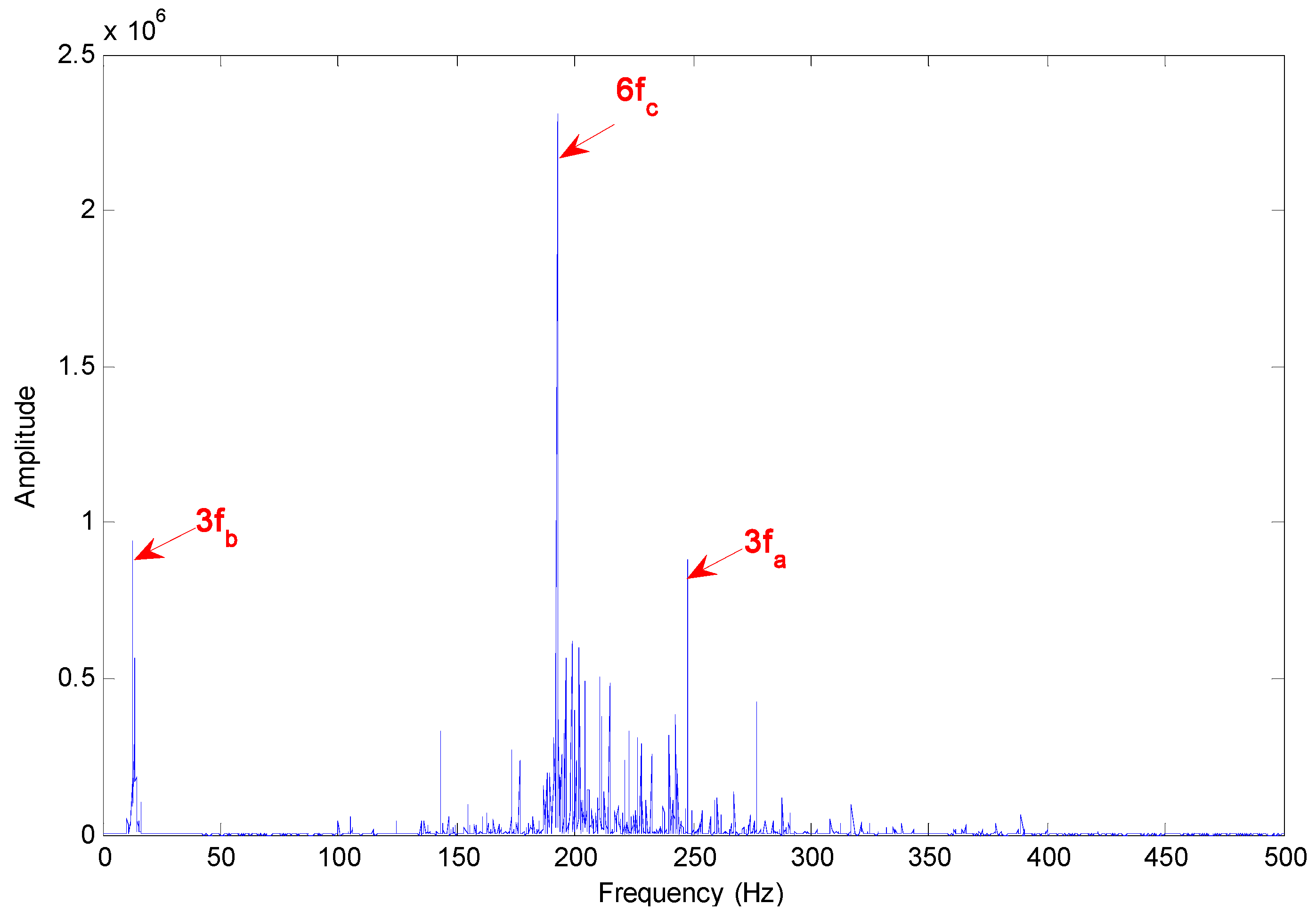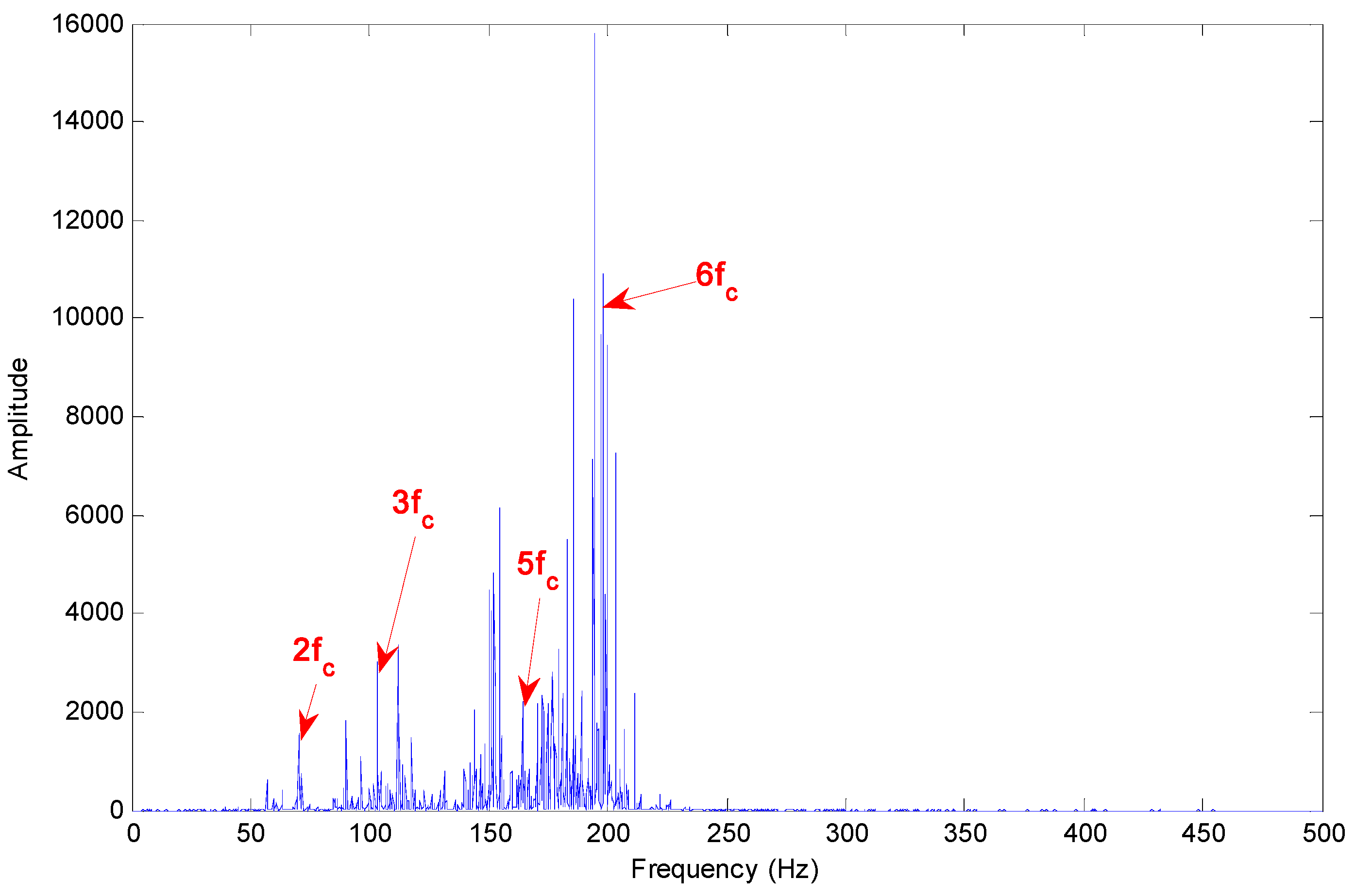 Figure 16. The presence of the faults is evident by that where the main peaks lie corresponds to the frequencies of 3 ×