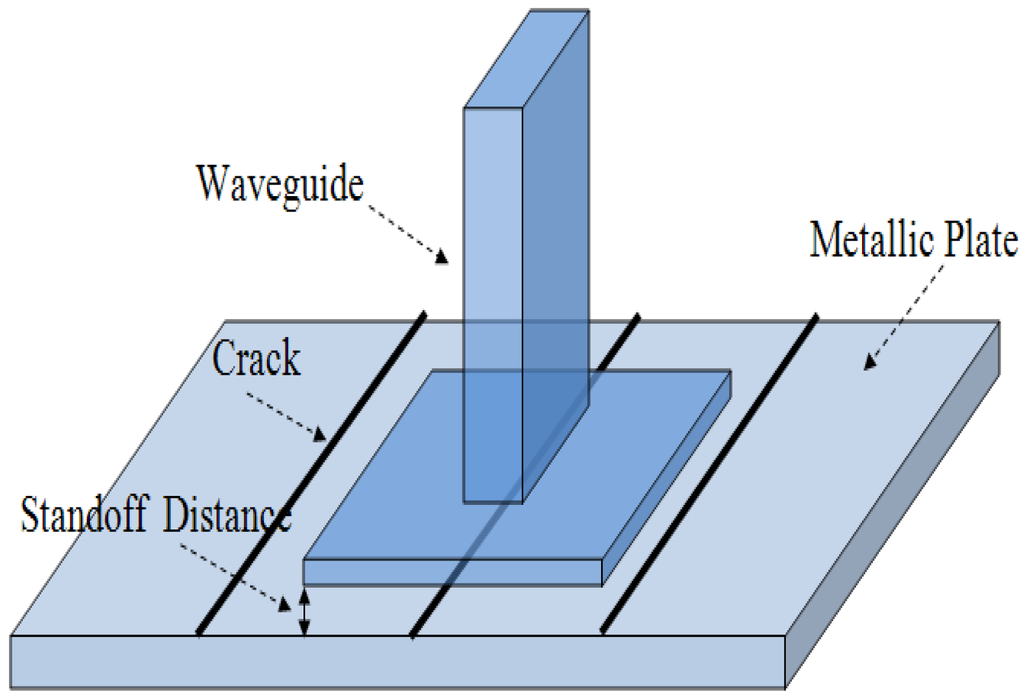 The sensor used in this work for scanning metallic surfaces was an open-ended waveguide probe enhanced with an array of split-ring resonator (SRR) cells [6]. The waveguide is operating at the Ku-band of 12–18 GHz and has a cross section of 15.8 mm by 7.9 mm, with a standard flange with dimensions of 33.30 mm by 33.30 mm. The experimental setup operates by scanning a metallic plate containing 0.5 mm surface cracks ranging in depth from 0.5 mm to 2.25 mm, with increments of 0.25 mm. Figure 1 below shows a diagram of a waveguide sensor scanning a metallic plate with cracks. The sensor is placed 0.5 mm standoff distance, with the long dimension of the waveguide being parallel to the cracks.