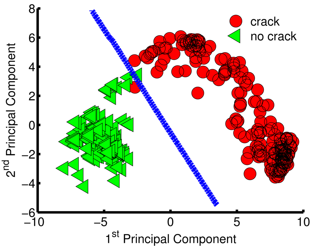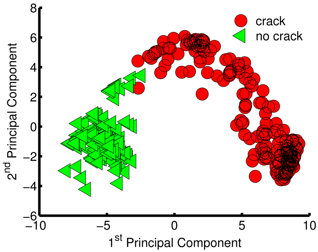 To visualize the data distribution in two-dimensional space, the first component was plotted against the second components (Figure 7). The green triangles represent samples/scans for non-cracked surfaces, and the red circles correspond to samples/scans with cracks. One important observation about Figure 7 is that the green triangles are concentrated in one region of the plot, whereas the red circles are widely spread. These concentrations differ because scans for surfaces with no cracks have the same pattern,but scans for cracked surfaces have different patterns as a result of varying crack depths. From the PCA results, three datasets were built in total: Dataset 1: a matrix of 415 samples and 2 features (first two principal components ); Dataset 2: a matrix of 415 samples and 8 features (first eight principal components ); and Dataset 3: a matrix of 415 samples and 13 features (first thirteen principal components that attained more than 95% of the collected data variance).
