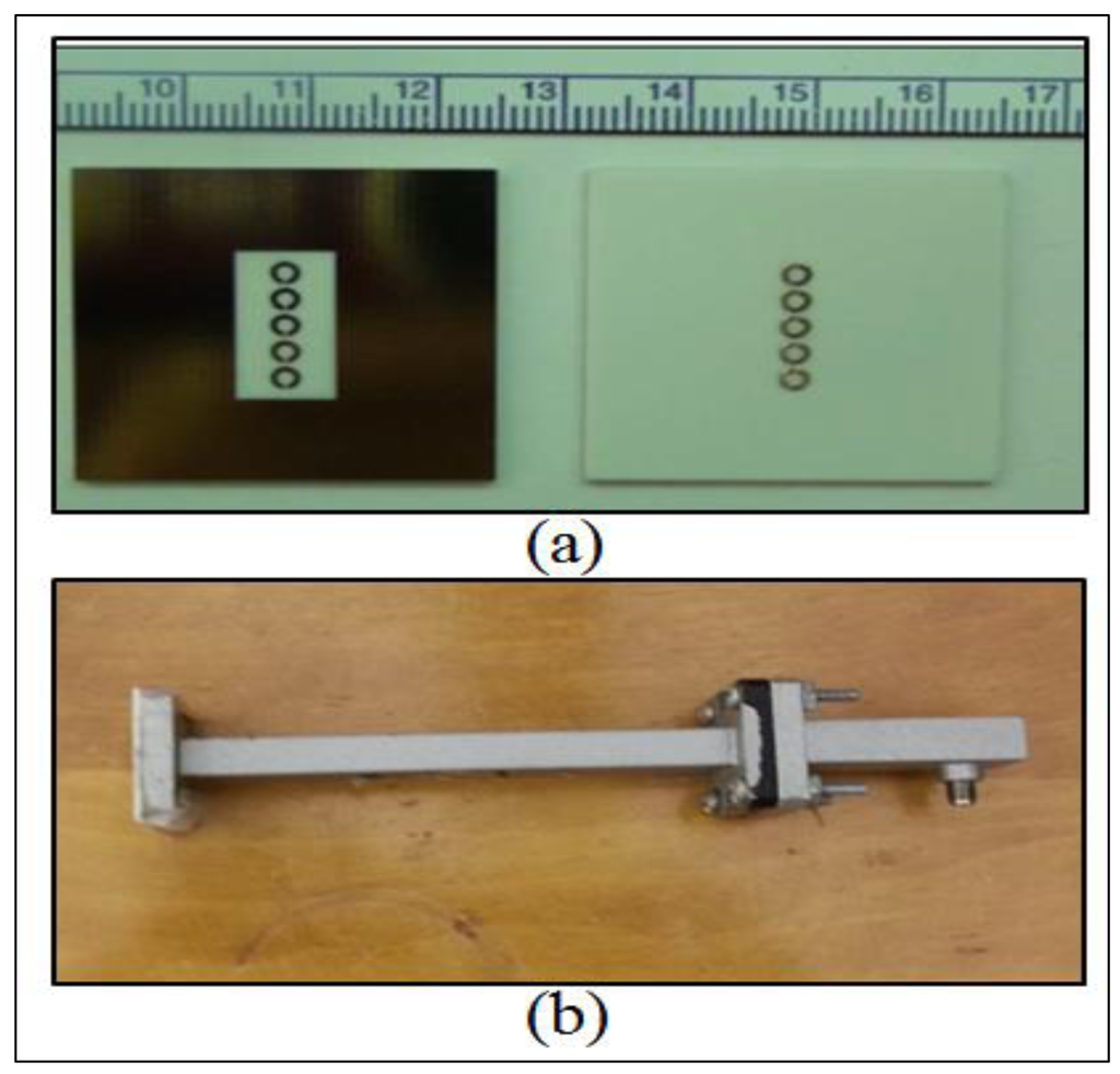 A printed circuit board (PCB) with low loss (Rogers 4003) was used to fabricate the SRRs. Figure 2a displays the front and back views of the PCB patch used at the open end of the waveguide. Figure 2b below shows a photograph of the waveguide sensor.