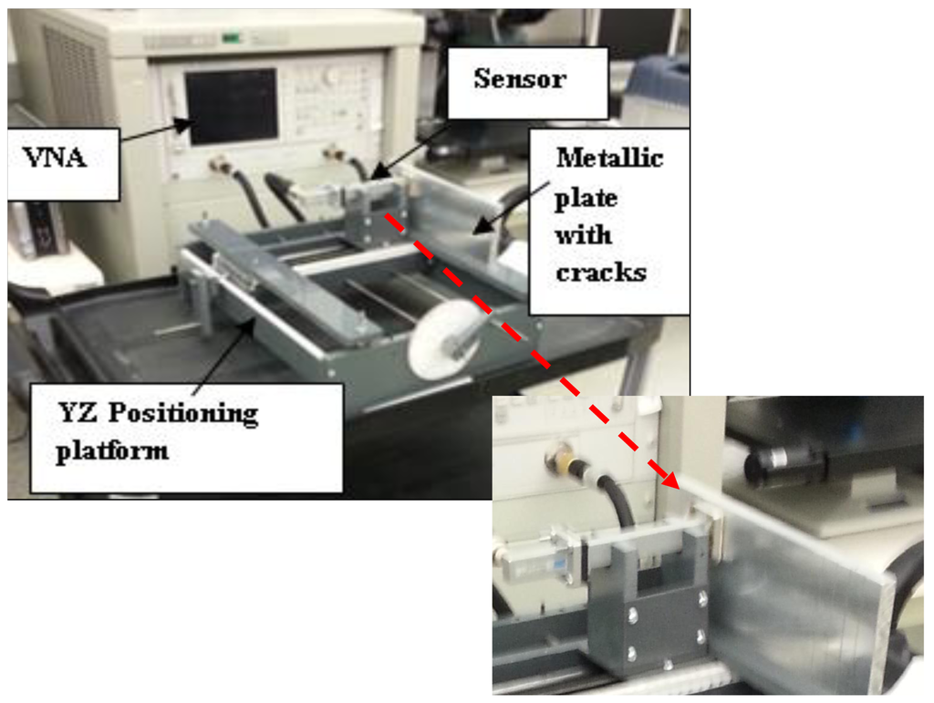 There are several well known non-destructive testing (NDT) techniques for detecting surface cracks in metals, such as acoustic emission, eddy current, and magnetic particle testing. However, all have some limitations. For instance, detecting cracks hidden under coatings or under paint is not possible using these methods. Additional limitations apply to cracks filled with different materials such as rust or dirt [1]. Microwave near-field testing techniques have unique advantages over other methods [1]. Unlike other NDT techniques, microwave near-field sensors have the ability to penetrate non-metallic materials and are sensitive to filled or hidden cracks [1–3]. In recent years, artificial engineered electromagnetic materials (metamaterials) have been implemented to create strong localization and enhancement of electrical fields around the sensing element in order to improve the sensitivity and resolution of microwave near-field sensors [4–6]. Metamaterial particles in one-dimensional or two-dimensional arrangements enhance the sensor's sensitivity to detect small anomalies [4,5].