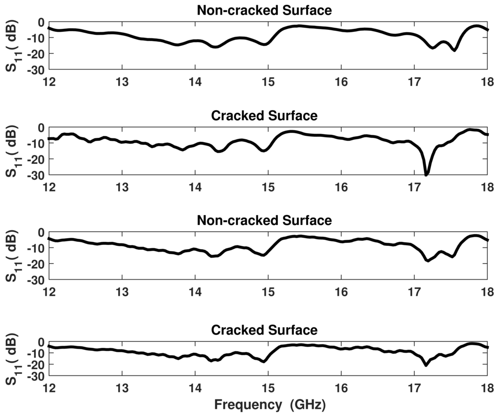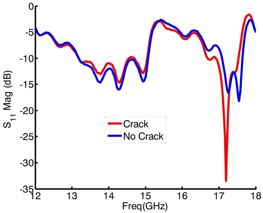 Based on the presence of a crack underneath the sensor, the magnitude of the reflection coefficient (|S11|) experiences a frequency shift and level change. In other words, the S11 pattern changes according to the presence or absence of cracks. In this experiment, for each scan, the VNA was swept over a frequency range compatible with that of the sensor (12 to 18 GHz), with increments of 30 MHz. Then the data was collected and saved in an array format to be used later by the AI algorithms.
