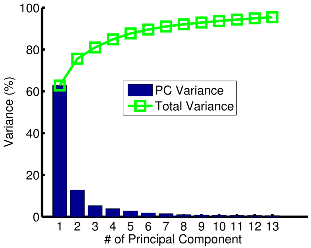 Principal Component Analysis (PCA) was used for data pre-procssing. PCA is one of the most widely used techniques for feature extraction and dimensionality reduction to build lower dimension datasets from higher ones. PCA finds a set of the most representative orthogonal projection vectors, where the projected samples retain the most information about original samples with the abilities to remove correlation among variables and enhance the signal to noise ratio [14,21]. Another effective feature extraction method is Independent Component Analysis (ICA), which maps input data onto basis vectors, which are as statistically independent as possible [21]. An important difference between PCA and ICA is related to the number of components used in each methodology. In PCA, this number can be determined by the variance criteria, but in the ICA, there are no criteria for determining how many components represent the dynamic range of the data [22]. Linear Discrimination Analysis (LDA) is another widely used feature extraction method for sensor development [14]. Unlike PCA, LDA requires class information (labels) to find a set of vectors that maximizes the between-class scatter while minimizing the within-class scatter [14,21]. Thus, PCA was implemented in this current study to build datasets of reduced dimensionality by extracting important features according to their variance contribution. PCA was applied after scaling the dataset to zero mean and unity standard deviation (Z-scaling). Figure 6 below shows the PCA results of the first 13 principal components. The PCA analysis shown in Figure 6, makes it clear that the first two principal components contribute more than 75% of the variance. Moreover, the first eight and first thirteen principal components achieve more that 90% and 95%, respectively, of the whole original dataset variance. Data visualization gives a good perspective about the data distribution and can help with selecting the learning algorithm. However, humans can handle only up to three dimensions. Therefore, one of the datasets built using PCA was chosen to be a two-dimensional (2-d).