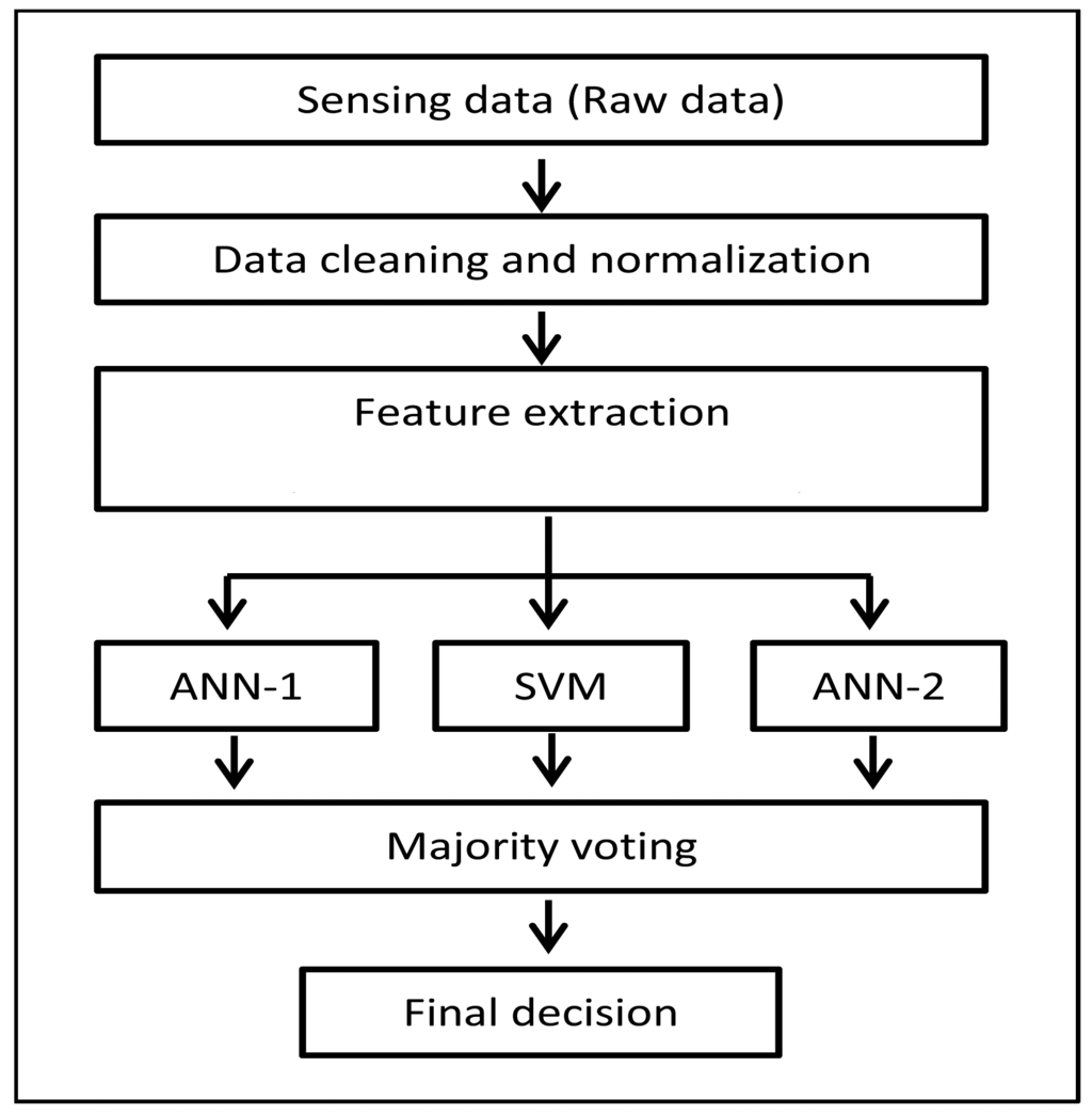 Each feature of the raw data collected by the sensor was normalized to its maximum value. The normalized dataset was then passed to the feature-extraction stage using PCA to generate the three reduced datasets. After feature extraction, the resultant datasets were delivered to the classification stage, where two ANN and one SVM classifiers were implemented to build a combined AI model. Figure 8 provides a flow chart of the data preprocessing and the Al model architecture. An odd number of classifiers was chosen to avoid ties during the combination phase.These classifiers were combined using a parallel manner (Figure 8).