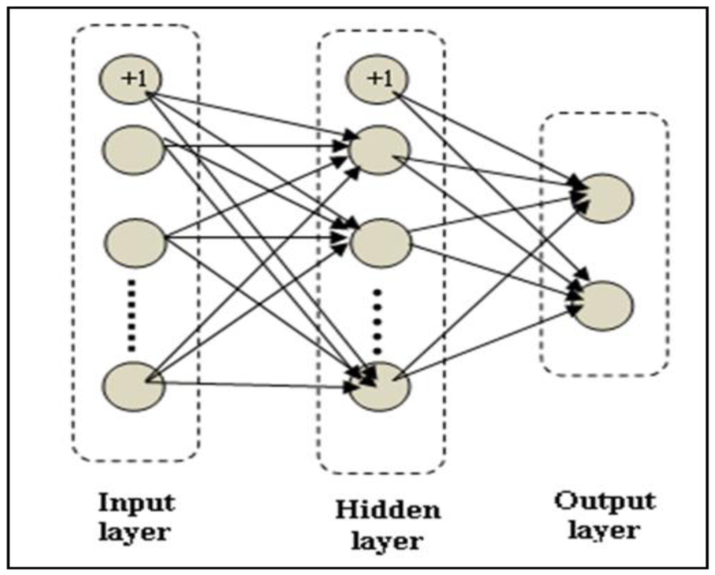 The ANN classifiers implemented in this work were based on a three-layer fully connected configuration, as shown in Figure 9, with a back-propagation algorithm and a log sigmoid function. In fact, different types of activation function used in ANNs, such as linear, step, Gaussian. In this work, a log sigmoid activation function has been selected as it has a convenient derivative (easy to compute from the sigmoid function itself), which is suitable when training networks using back-propagation algorithms [24]. The log sigmoid transfer always limits its output to the range between 0 and 1, as given by