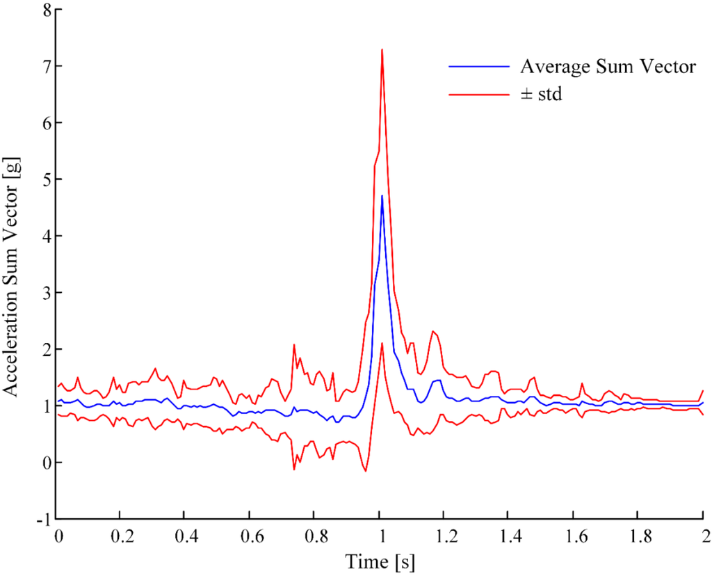 Average (±1 standard deviation) acceleration sum vector (centered on the peak) over the 29 real-world falls.