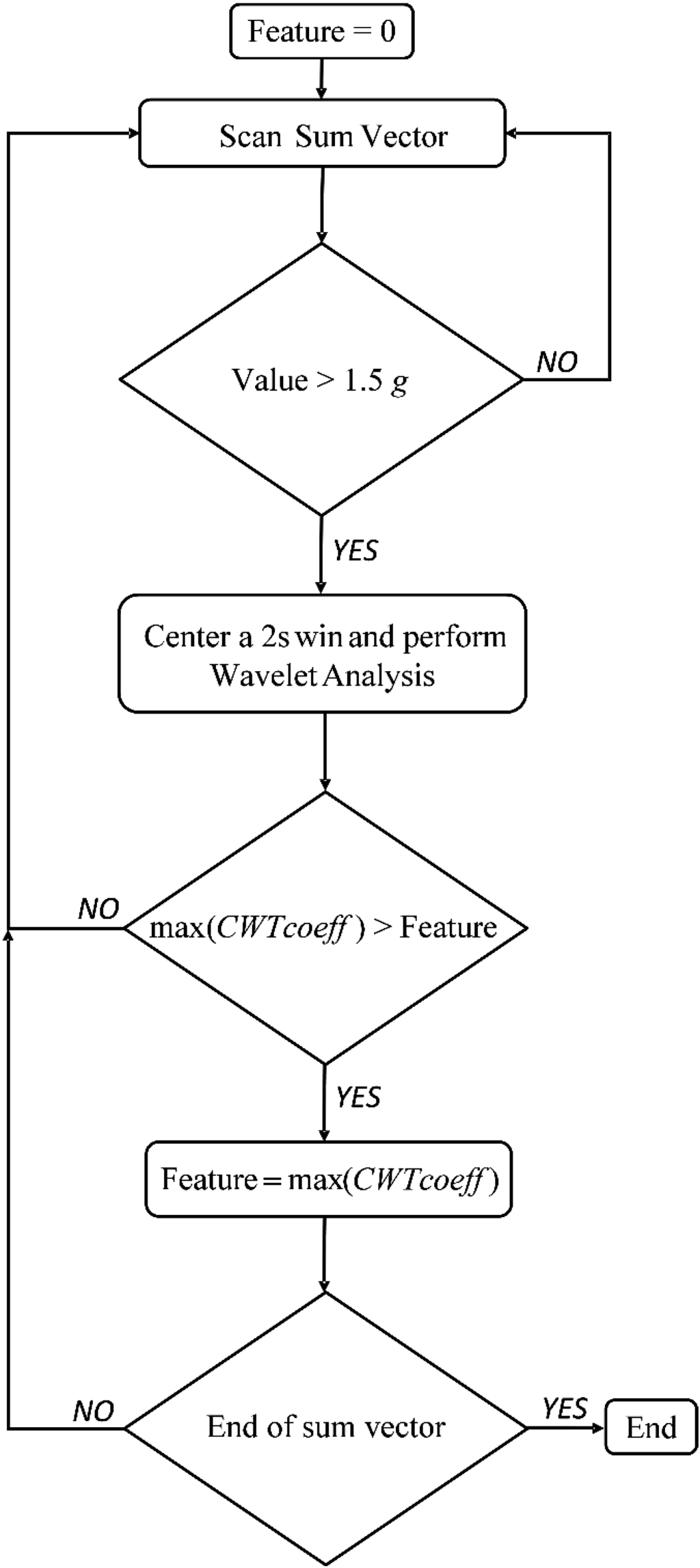 Then, the scanning of the signal continued. Each time SV was over the threshold, the analysis was repeated. In the end, the feature value was the overall maximum value of CWTcoeff. If no SV value over the threshold was found in the recording, then the feature value was zero (see Figure 2).