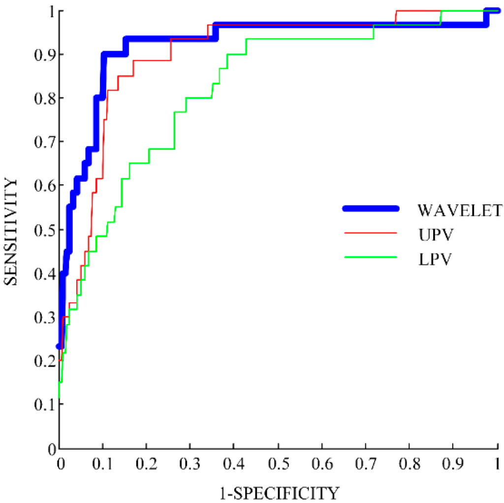 The wavelet-based feature shows a higher ROC curve than the other features (LPC and UPV) for most of the possible combinations of sensitivity and specificity (Figure 3). In Table 1, two performance measures are reported: the AUC and the maximum YI values.