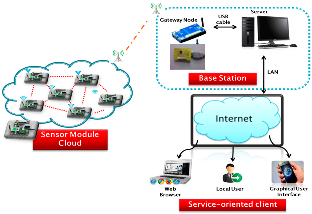 This IAQ monitoring system consists of three parts: sensor module cloud, base station and service-oriented client. The sensor module cloud (SMC) contains collections of sensor modules that measure the air quality data and transmit the captured data to base station through wireless network. Each sensor modules includes an integrated sensor array that can measure indoor air parameters like Nitrogen Dioxide (NO2), Carbon Dioxide (CO2), Ozone (O3), Carbon Monoxide (CO), Oxygen (O2), Volatile Organic Compounds (VOCs) and Particulate Matter (PM10) along with temperature and humidity.