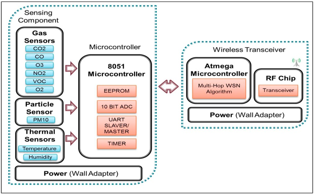 The sensor module is used to sense and measure air quality in indoor environment. Figure 2 depicts a schematic diagram of the major components of the sensing module. Basically, there are three major components: sensor components, microcontroller and wireless transceiver. This entire component is powered-up by using wall adaptor for continuous power supply.