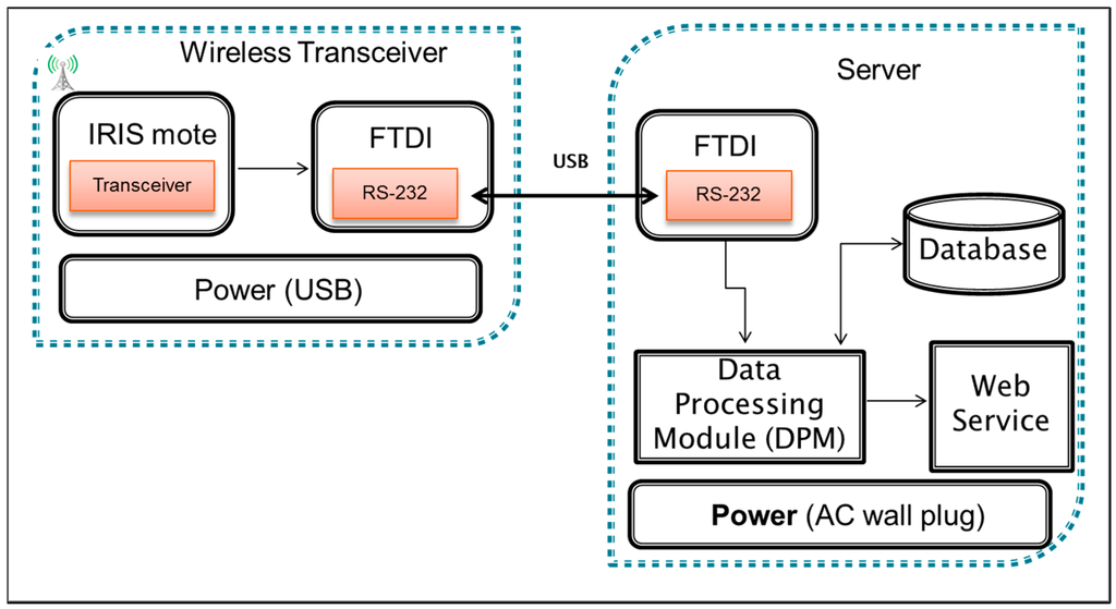 The base station in IAQ monitoring system contains two components which are wireless transceiver and a server that act as a data logger. The base station is responsible for managing, collecting and recording the data before displaying it on a computer screen and on the web service. The wireless transceiver unit is similar to the sensor module, which contains IRIS mote—ATmega1281 low power microcontroller and AT86RF230 radio frequency (RF) [29]. It also contains Future Technology Devices International (FTDI) device which emulates RS 232 transmission protocol and communicates with Data Processing Module (DPM). DPM is responsible for processing and writing the air quality data into the database. At the same time, DPM sends the data to the Web Service which allows users to access the information in real-time. A simple database is based on a SQLite format which is used to log the data for further processing (if necessary) on the server system. SQLite has been selected instead of alternatives like MySQL simply due to the fact that it is easier to setup and it uses single file storage. However, due to its limitation of storage, the DPM has been programmed to create one SQLite file which contains one week of data, and this process is repeated for the following weeks. Figure 4 shows the block diagram of the base station.