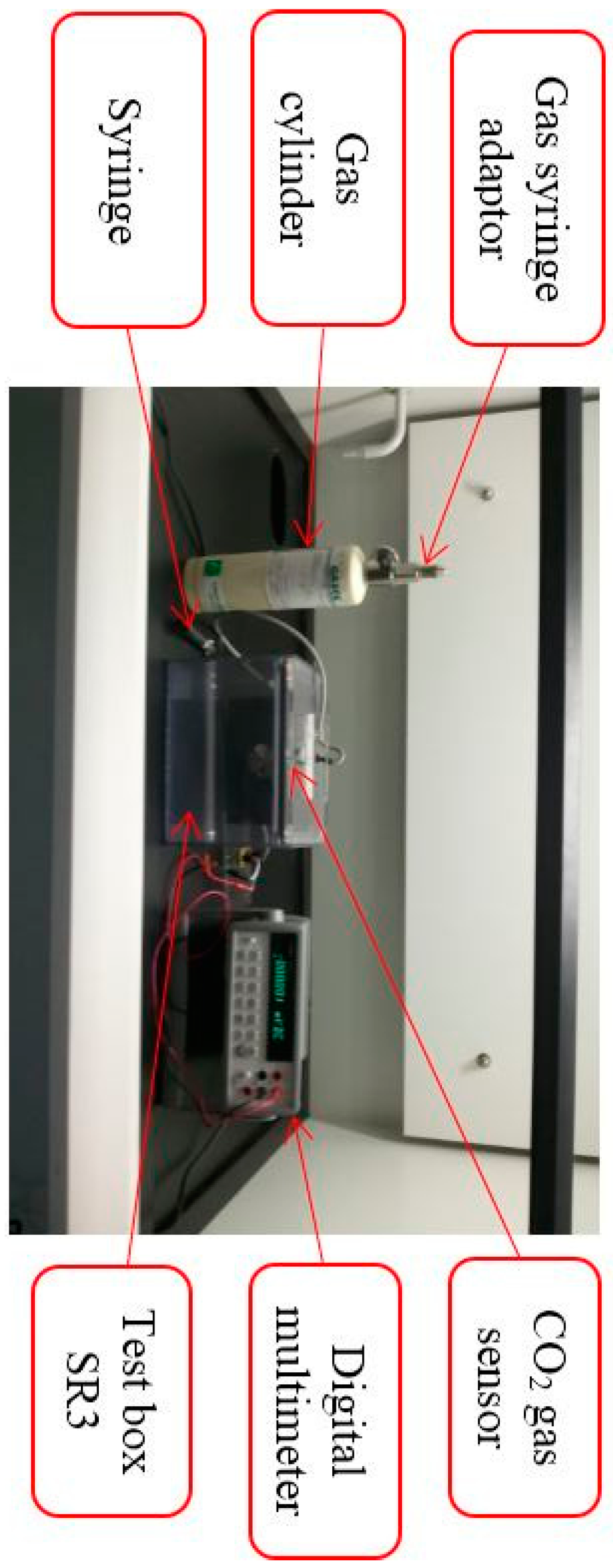 Calibration of gas sensors is one of the main challenges during the development phase. Although calibration was carried out for all sensors, the discussion was limited only to the calibration of CO2. Calibration of the CO2 sensor was performed in a laboratory environment with each sensor mounting in a completely sealed gas test box SR3 (manufactured by Figaro) specially designed for the testing of gas sensors to avoid any other gases affecting the experiment. The size of the box is 235 mm × 180 mm × 210 mm. Figure 6 shows calibration setup for CO2 gas sensor which was set in the test box.