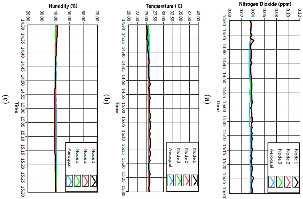 Validation procedure had also been carried out to make sure that the data collected by the self-developed sensor node was similar to the data collected by a commercialized device. The discussion of this procedure was limited only to the NO2, temperature and humidity sensors. The sensor validation was carried out with Aeroqual portable indoor monitor device (a professional grade air quality measurement system) which had been pre-calibrated [36]. Three sensor nodes and the Aeroqual device were placed in a clear sealed glass container of 100 × 40 × 30 cm which was completely sealed. Then, the gas concentration inside the sealed container was made varied by injecting the particular gas of interest. The outputs of the sensors were recorded continuously for 1 h and plotted (Figure 8). Figure 8a shows that the result of NO2 sensor when 35 ppb of NO2 gas concentration was injected to the sealed container. It can be observed that the value for all sensor nodes including Aeroqual device gave relatively similar readings for 1 h period. During the experiment, the same room temperature setting at 25 °C was applied as shown in Figure 8b while Figure 8c shows the readings for humidity.