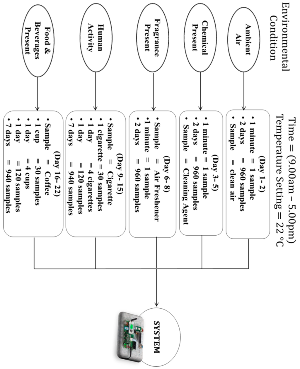 The experiment was conducted in a medium-sized room of 4.5 m × 2.4 m × 2.6 m. There was an air-conditioner located at the center of the room at a height of 2.2 m from the ground. The sensor module was installed hanging up to the wall of the room at a height of 1.1 m from the ground. According to the Malaysian Standard on IAQ, the monitoring device or instrument should be positioned at a height between 75 cm and 120 cm, preferably 110 cm from the floor [37]. This position is considered as a breathing zone for the occupants. The node was powered up by using adaptor 7.5 V and was programmed to send the data to the base station every 1 minute. The data collection was conducted in 22 days between 9.00 a.m. and 5.00 p.m. with the room temperature set at 22 °C. Every day, after each experiment, the air in the room was purged out by opening windows to clean the air. Figure 9 shows the process of data collection for all five conditions from day 1–22.