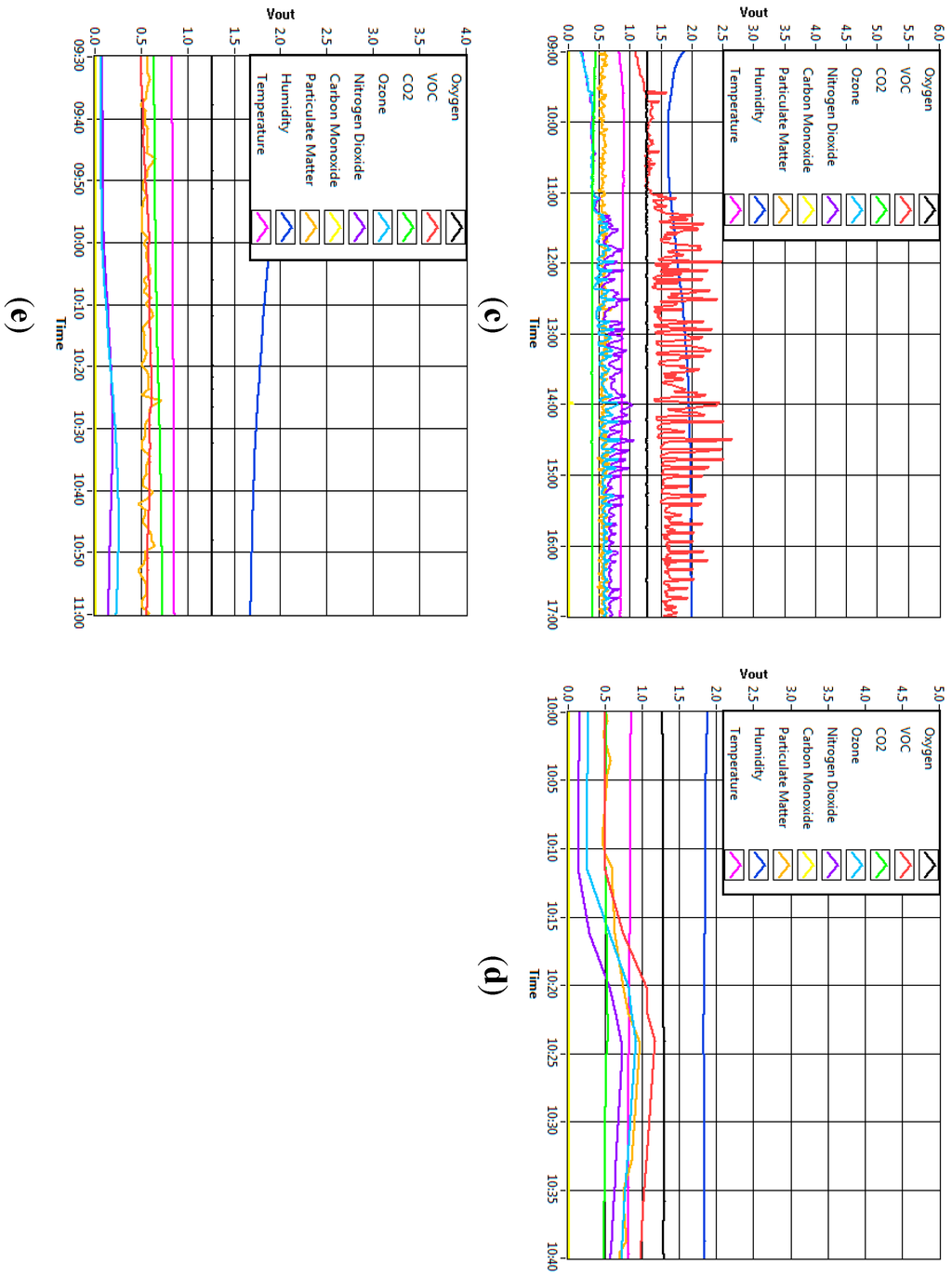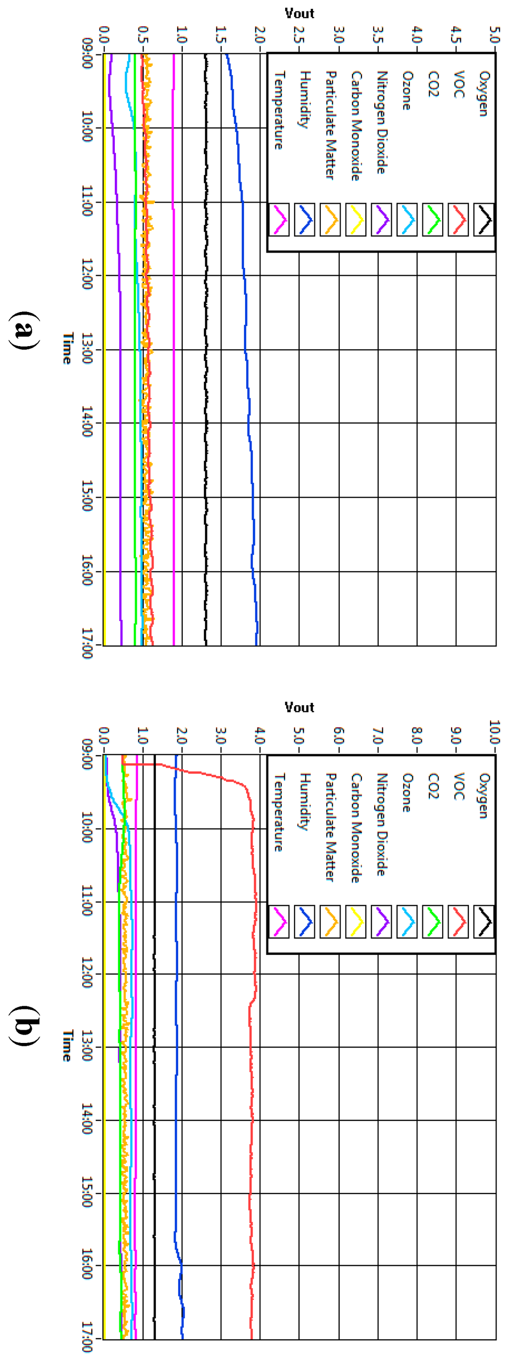 Figure 10 below shows the sensors response toward five different environments which are ambient air, human activity, chemical presence, fragrance product (air freshener) and foods and beverages (coffee). The data was taken from one of samples of the experiments. They showed that the values of the sensors of the module give different responses to the environment. The response of the sensors indicated that the sensing module of the system functions accordingly to the varying sample concentration of different environment conditions. From the graphs, it is clear that the sensor node gave different reactions towards different environments. In Figure 10a, the sensors gave a relatively steady reading throughout the time. The sensors’ response was as expected since there was no substance which could interrupt the ambient air concentration. On the other hand, in Figure 10b, with the presence of chemical substance, it can be observed that certain gas sensors such as VOC, NO2 and O3 reacted differently as compared to ambient environment. The reading of VOC gas sensor particularly, rose sharply when the chemical was present in the room. Figure 10c represents the response of the sensors when the automatic air freshener released fragrance into the room every 15 min. The fragrance of the air freshener, however, vaporized quickly into the air after it was released. Thus, these changes of high and low concentration of fragrance in the air could be observed from the disturbed graph. Meanwhile, for the last two environments, 30 min of data were recorded instead of 8 h because these two environments had impact on the sensors for a short amount of time. Figure 10d illustrates the effect of the cigarette smoking activity on the sensor while Figure 10e denotes the presence of food and beverages (coffee) in the room. Notably, in all graphs, different sets of gas sensors reacted differently to different environments.