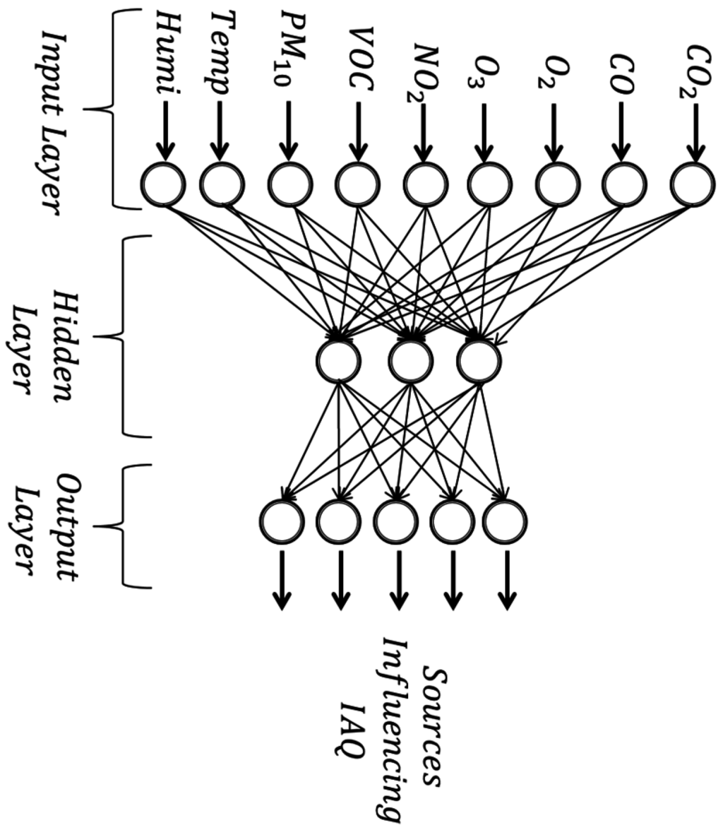 In order to identify the source affecting the IAQ, this study used the multilayer feed-forward neural network which consists of three layers: input layer, hidden layer and output layer. As network architecture, a three-layer perceptron model as shown in Figure 12 was used.