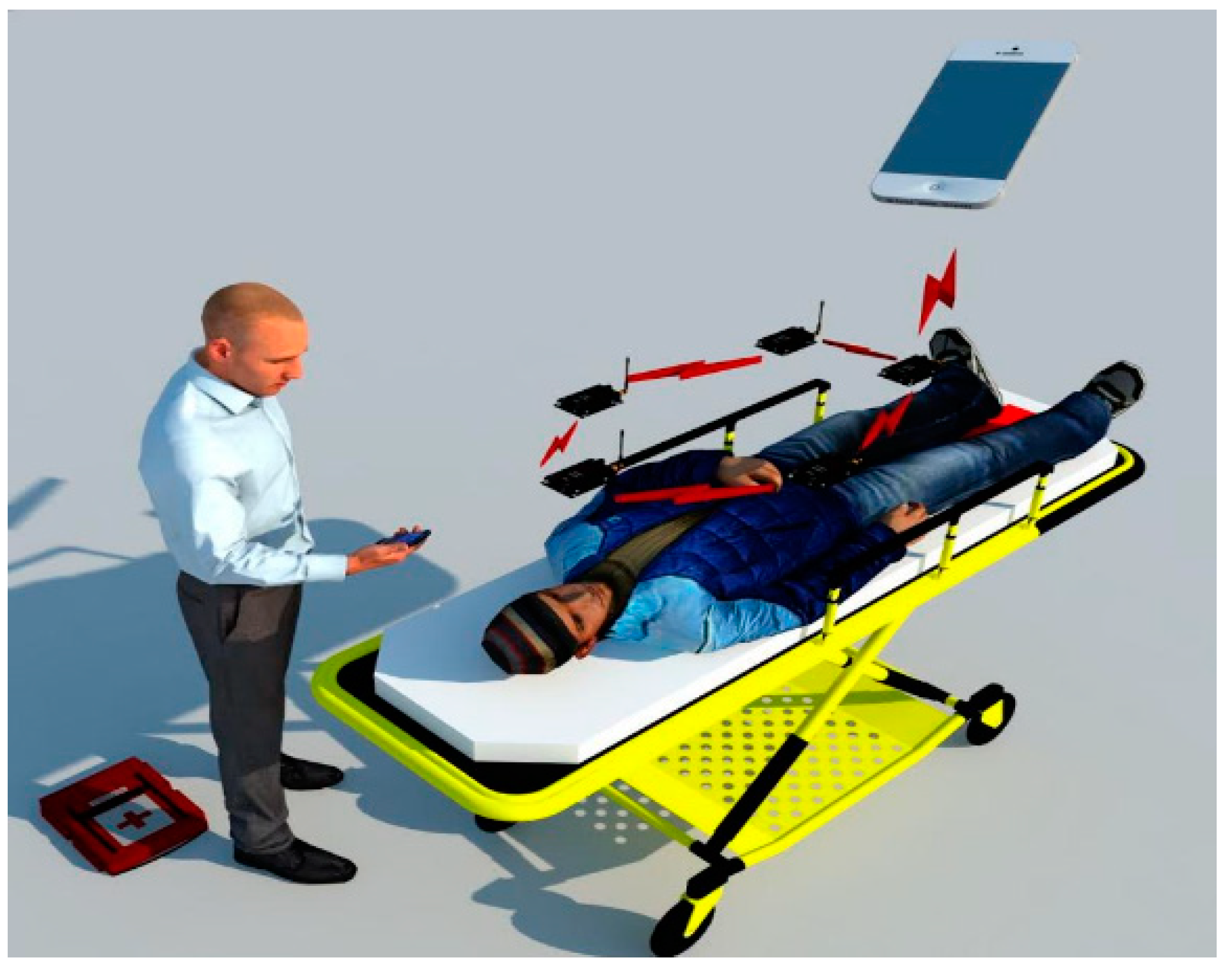 - Inter-WBSN Communication: This tier corresponds to the communication between the PS to the internet or between PS and one or more RPs and then to the internet. If the signal drops, data could be sent to an RP/PC server (inside the ambulance) and afterwards, the information will be sent wirelessly (Wi-Fi) to the data base server. At this level, a gateway, PDA, PC, or 4G antennas are the link between de Intra-BAN and Beyond-WBSN layers. This tier needs some hardware and software requirements due to the specifications of the device, in terms of developing friendly user interfaces, and collecting and processing efficiently the sensors’ data in real-time [32].