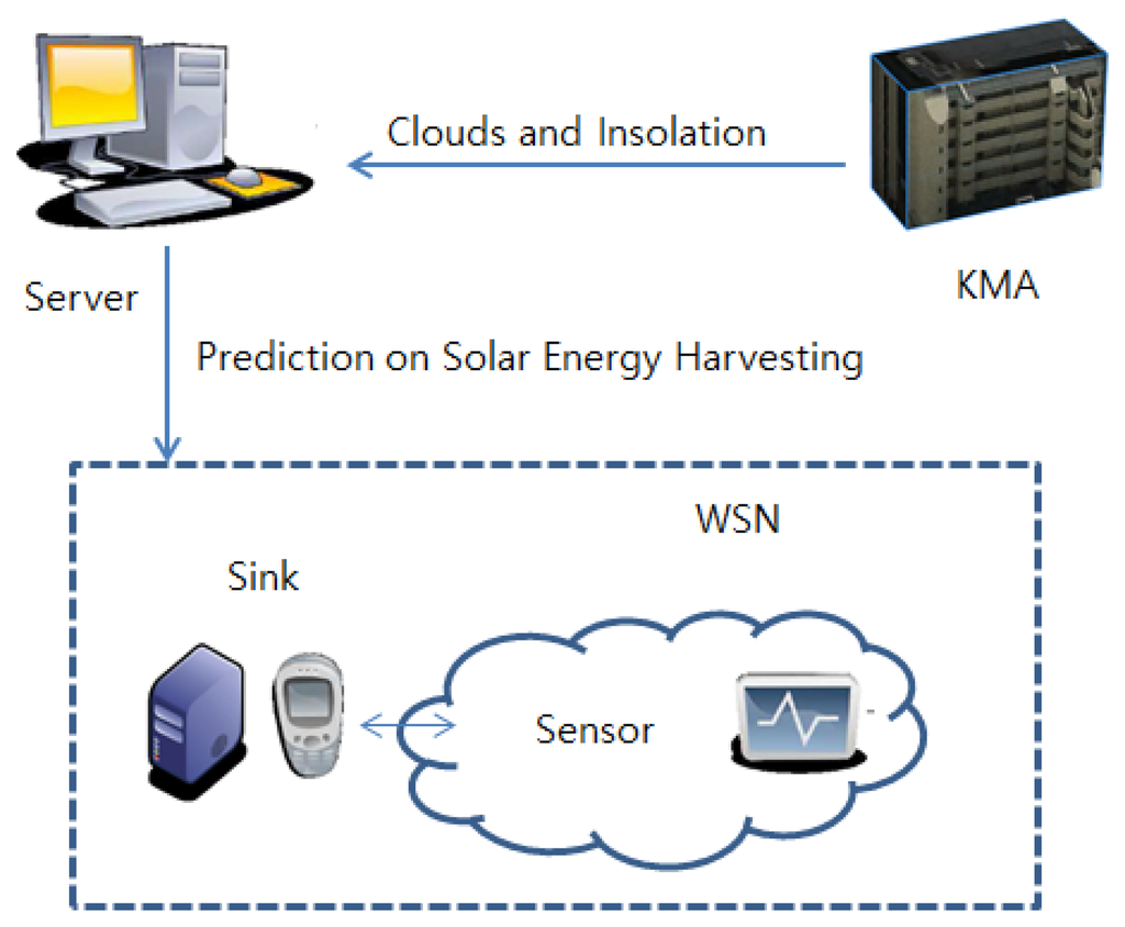 The proposed scheme predicts the future insolation by analyzing the relation between the past insolation and the cloud amount. Cloudy computing [3] has to collect the sunshine intensity at a specific area for several months to predict harvested energy. On the contrary, our method brings past weather information from KMA (Korea Meteorological Administration), as shown in Figure 1, without collecting this large amount of data. Thus, this system can be quickly deployed and used in any region without much advance preparation. Furthermore, the server estimates the future insolation based on the KMA data on behalf of sensor nodes and broadcasts it to the sensors. Therefore, each sensor does not have to receive a large amount of data from KMA and can save its energy for computation. In addition, since the server was designed to deal with weather data presented in the XML format (KMA provides the data in XML format), our system can be used in any country if their meteorological administration provides the weather data in an XML-compatible format. However, there may be an issue regarding the accuracy of the KMA data, since KMA provides data, not for the small region covered by a WSN, but for a large area, like a city. Moreover, the KMA data are sensed every hour on the hour, not at every instant. Currently, we argue that this kind of inaccuracy is a trade-off for the simple architecture and easy usage of the proposed system. Later, if the data for the difference between KMA information and sensed values are accumulated for a long time, the inaccuracy can be overcome by adopting a linear regression method.