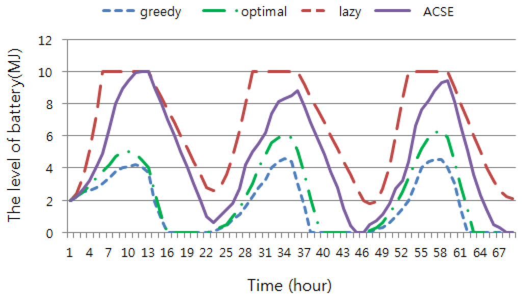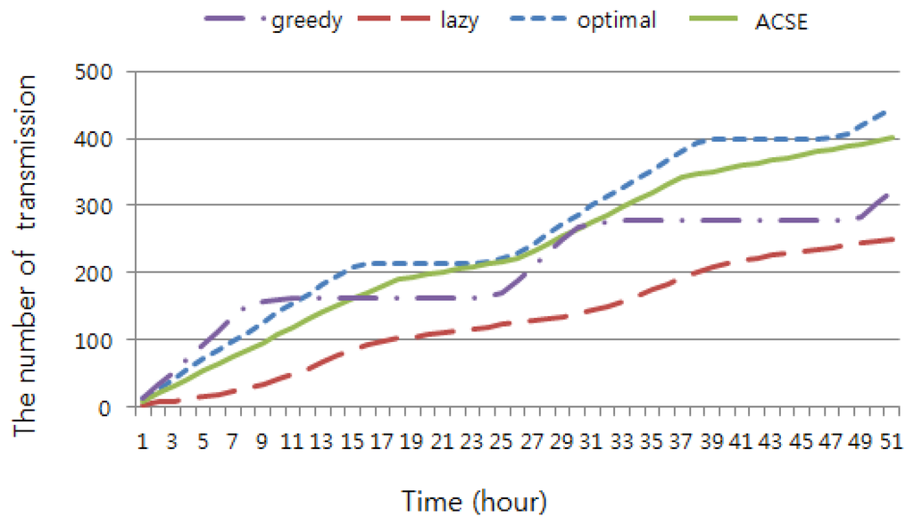 Figure 9 shows the variance of transmission numbers against the simulation time. At first, the greedy method sent more packets than the others, but the number of transmissions became stable during some intervals, e.g., 9 to 25 and 31 to 47 h from the starting time. The greedy method consumed all of the energy very quickly, and it could not send more packets until the battery was recharged. Solar energy cannot be harvested at night. Furthermore, the solar radiation in the early morning and in the late afternoon was not strong enough to harvest as much as the energy needed for packet transmission. On the other hand, the lazy method held off packet transmissions throughout the simulation so long as their deadlines had not passed. Conclusively, as time grew, the optimal and the proposed ACSE showed the best performance in terms of throughput. Note that, mentioned before, the optimal method needs several strict assumptions, e.g., entire packet generation information and accurate estimation of harvested energy.