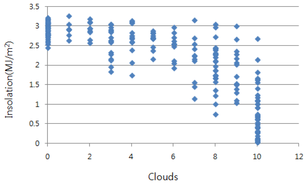 KMA measures the cloud amount and insolation every hour. Furthermore, they provide their own prediction on cloud amount and insolation for the next three hours. The amount of cloud is scaled from zero to 10. The closer to 10 it is, the more clouds there are. Figure 2 shows the distribution of pairs of cloudiness and insolation in June from 2003 to 2012. We can see that the insolation is tightly related to the amount of cloud. The more cloud there is, the lower the insolation intensity is. Our method predicts the insolation intensity by using this relationship. This procedure consists of four steps. Let us examine each step with an example:
