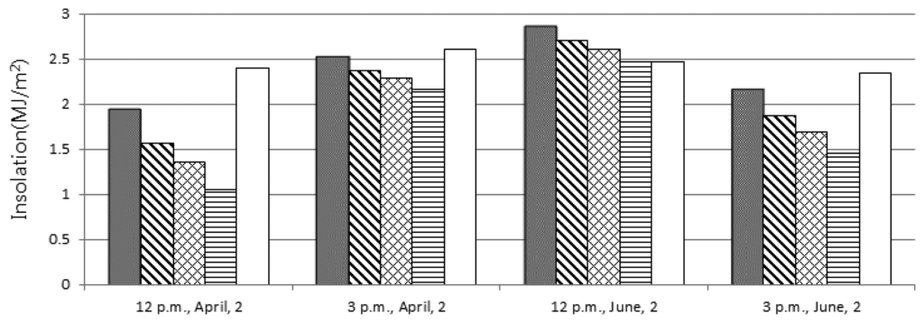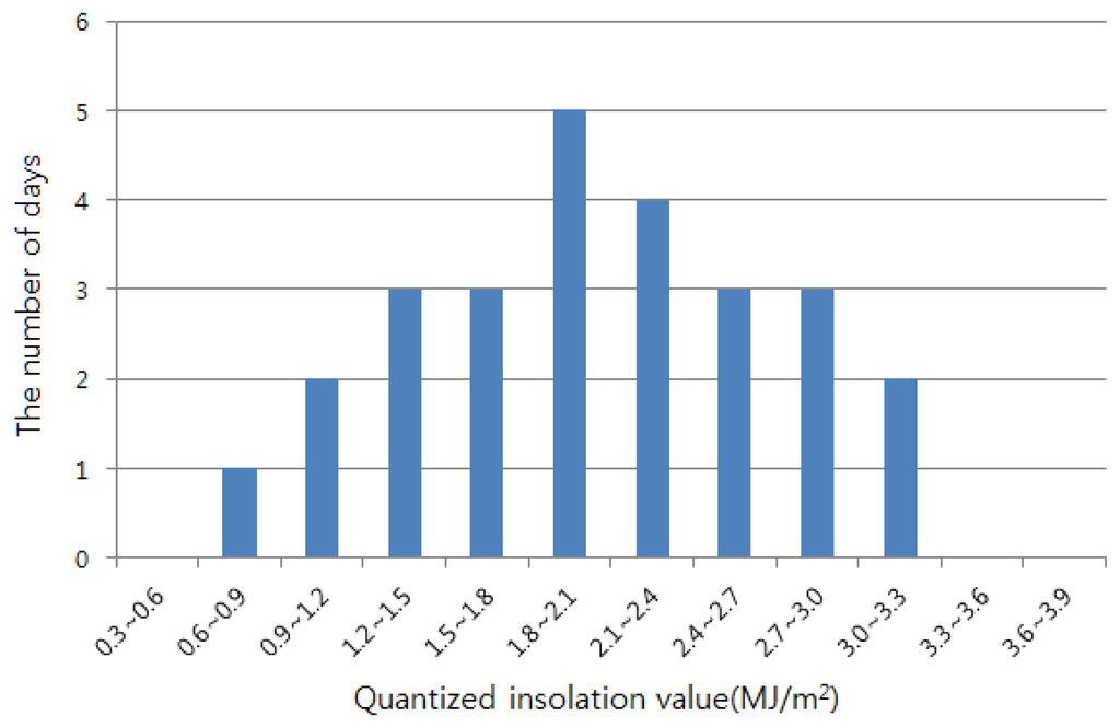 As mentioned above, we got a total of 200 data (10 years × 20 days/year) from the KMA database, but we do not use all of the data. First, we filter out the days for which the cloudiness situation was different from the target instant. If the degree of cloudiness was predicted as seven by KMA at the aforementioned instant, 3 p.m., 2 August 2013, we extract only the data of the days whose cloudiness was seven. Figure 3 shows this screening result, with the number of days being counted for each quantized insolation intensity value (MJ/m2). For instance, the number of days for which the insolation value was between 1.8 and 2.1 is five. Eventually, we can estimate the insolation at the target instant by averaging all of the insolation intensity values in Figure 3.