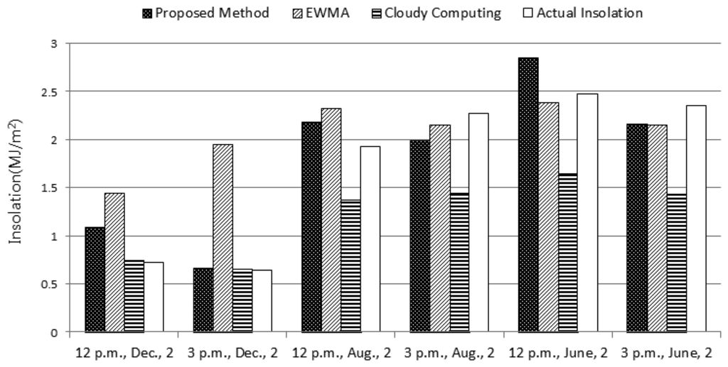 Figure 5 illustrates the insolation estimated by several schemes. For the proposed method, the original estimation values without the complementation using any confidence level are used. Although our method overestimates the insolation sometimes, the accuracy is very high in comparison with others. The accuracy of the proposed method and cloudy computing are 85.02% and 78.09%, respectively, the difference being 6.92%. Particularly, EWMA excessively underestimates the insolation, with only an accuracy of 40.52%, which may degrade the performance of the WSN too much.