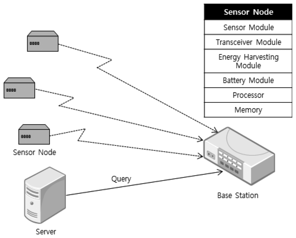 Our model is similar to [7] in which a base station exists, and each sensor node has a periodic and an aperiodic task. Figure 6 shows a system consisting of a sensor, a transceiver, an energy harvesting module, a battery, a processor and memory. Each node sends packets to the BS (base station), and then, the BS forwards them to the server after data aggregation. The energy level in the energy storage module is between Bmin and Bmax. H(t, h) in Equation (4) denotes the estimated energy to be harvested for h hours from t, and p(t) is a function to predict the amount of harvested energy for one hour starting from time t.