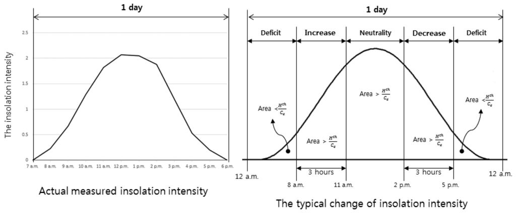 The insolation intensity for a day typically has the form of a bell curve, like Figure 7, unless the weather changes abruptly during the daytime. The actual harvested energy is proportional to both the intensity and the conversion efficiency of the solar module. In the figure, Hth and ce denote the energy that the sensor application requires and the convergence efficiency of the solar module.